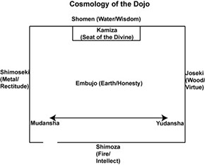 I explained a little about the worldview represented by the dojo. I borrowed a pen from our server and drew a diagram on a napkin showing the four walls of the dojo and the elements associated with them, filling in the practice area and the kamiza. I explained the rituals, the etiquette, and their purpose. The food came, but he was polite enough not to start eating until I finished my explanation.